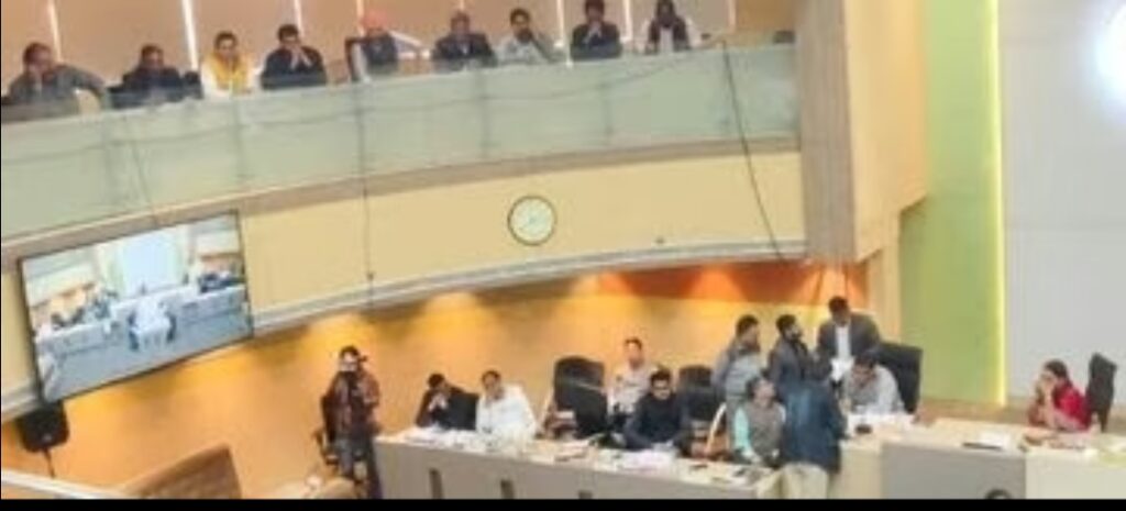 चंडीगढ़ निगम की बैठक में मेयर को आया फोन:हंसी-ठिठोली में बदला माहौल, 24 घंटे पीने लायक पानी के एजेंडे पारित नहीं चंडीगढ़ शहर में चौबीस घंटे पीने लायक पानी के साथ साथ मनीमाजरा पॉकेट नंबर 6 की जमीन बेचने पर फिलहाल रोक लग गई है। निगम हाउस की बैठक के दौरान एक दिलचस्प घटना क्रम हुआ है, जिससे एक दम गंभीर माहौल हंसी ठिठोली में बदल गया।नगर निगम हाउस की बैठक में जैसे ही मनीमाजरा हाउसिंग प्रोजेक्ट पर मेयर हरप्रीत कौर बबला घिरीं तो अचानक उनका फोन बजा, उनकी तरफ से फोन पर कुछ बात करने के बाद नगर निगम कमिश्नर अमित कुमार को पकड़ा दिया।तभी सामने खड़ीं पार्षद प्रेम लता ने इस पर चुटकी ली और कहा बबला भाई का फोन है, बाद में हाउस हाल के ऊपर बैठे बबला की तरफ इशारा करते हुए कहा कभी हमें भी गाइड कर दिया करो…. और हॉल में सभी हंसने लगे।